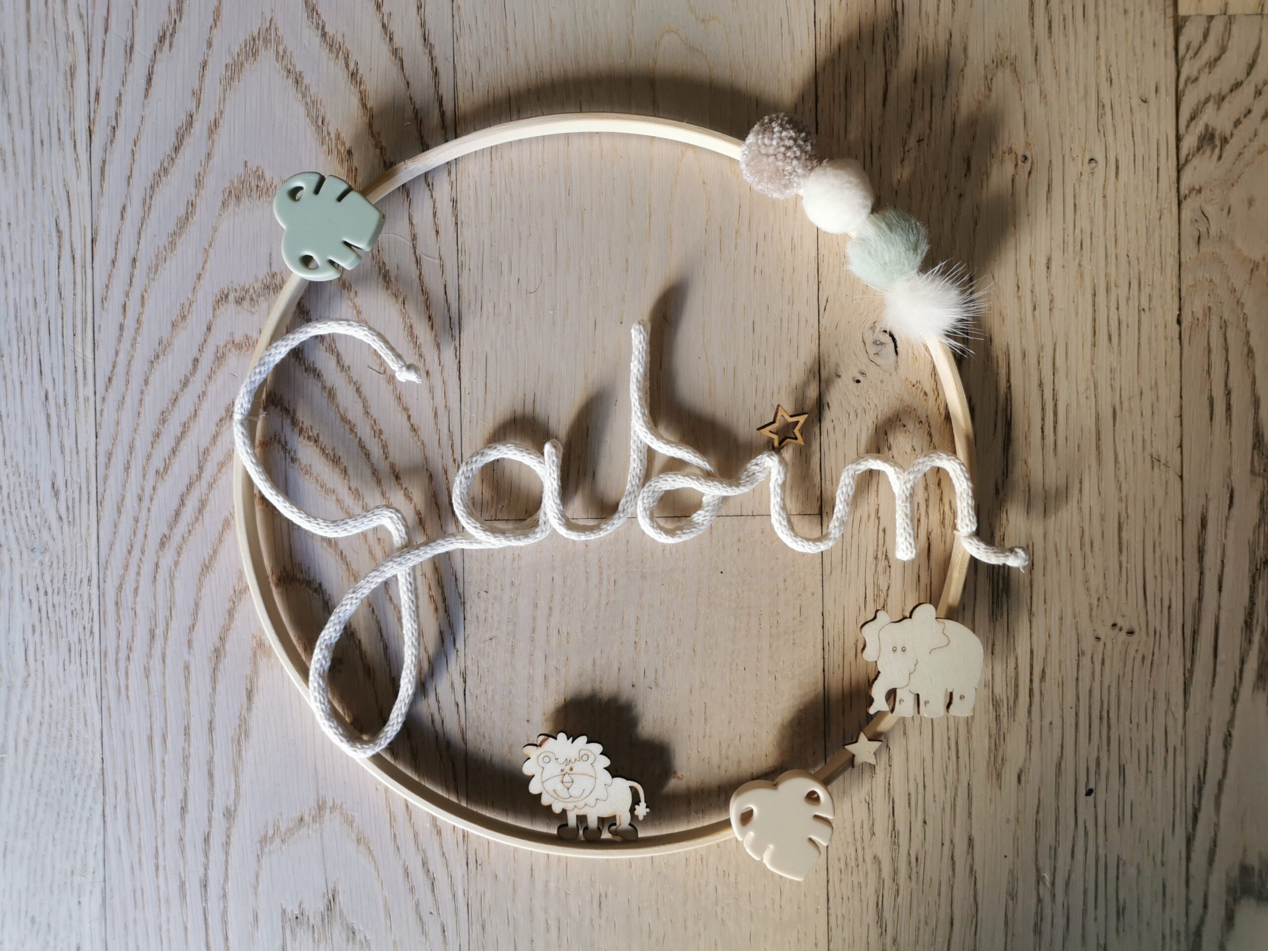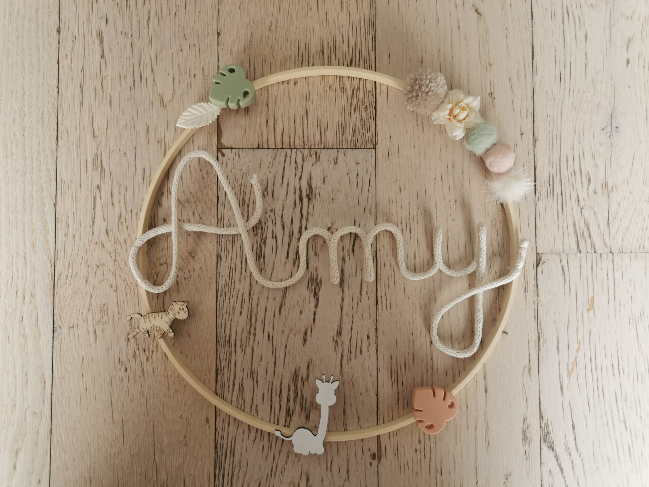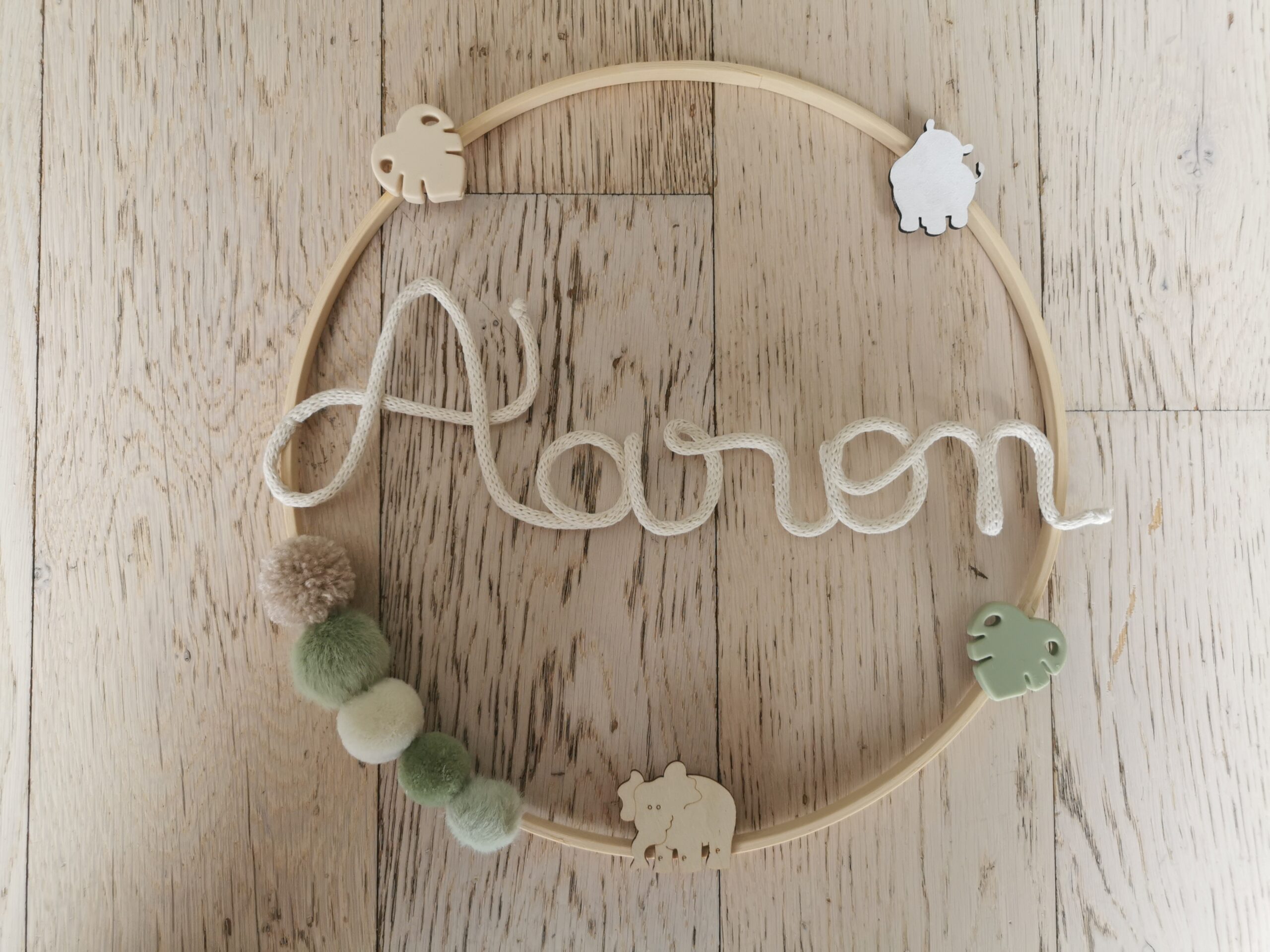 Prénom tricotin sur bois flotté et animaux