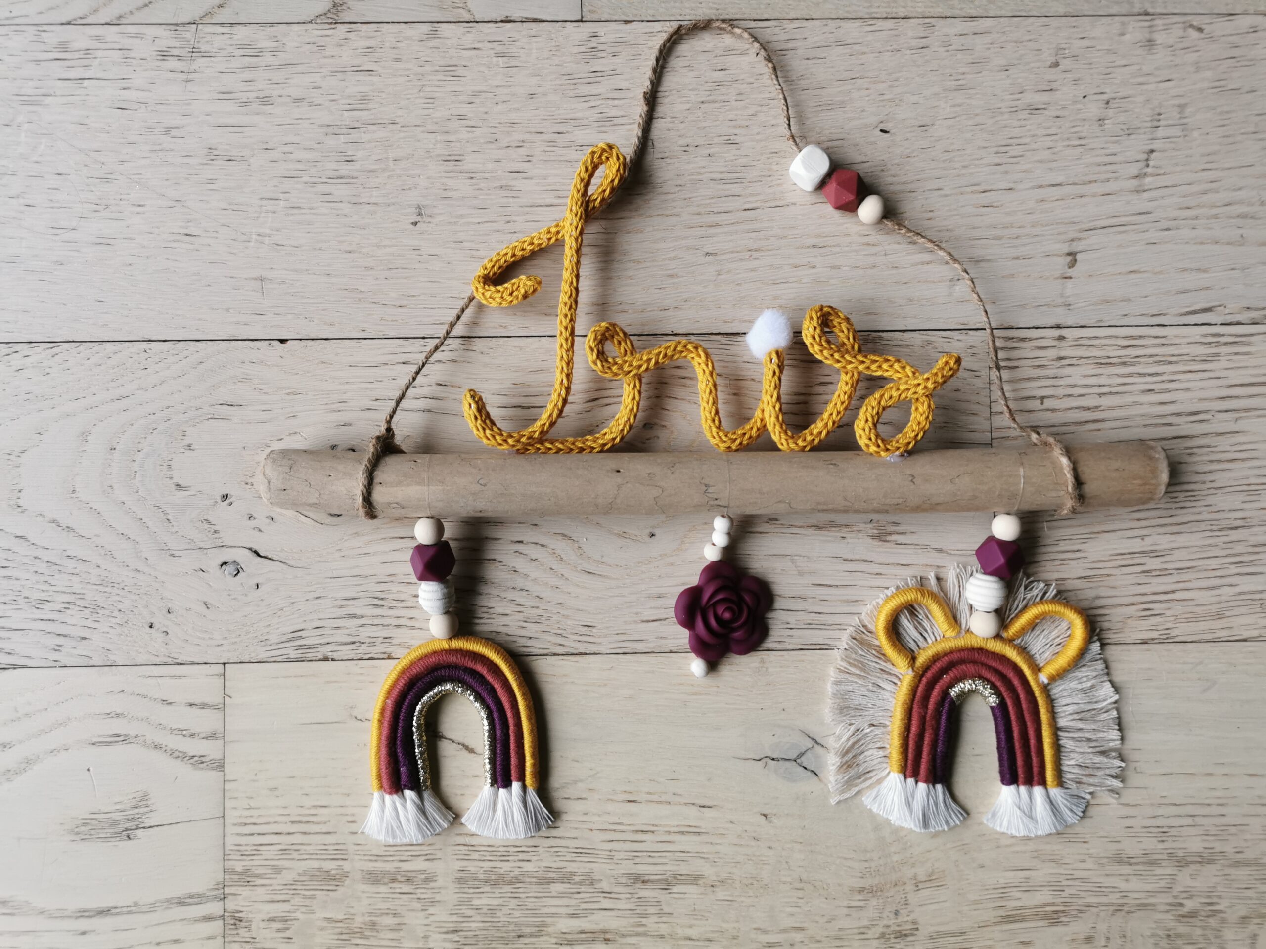 Soyez le premier à laisser votre avis sur “Prénom en tricotin sur bois flotté / arc en ciel + personnalisation”