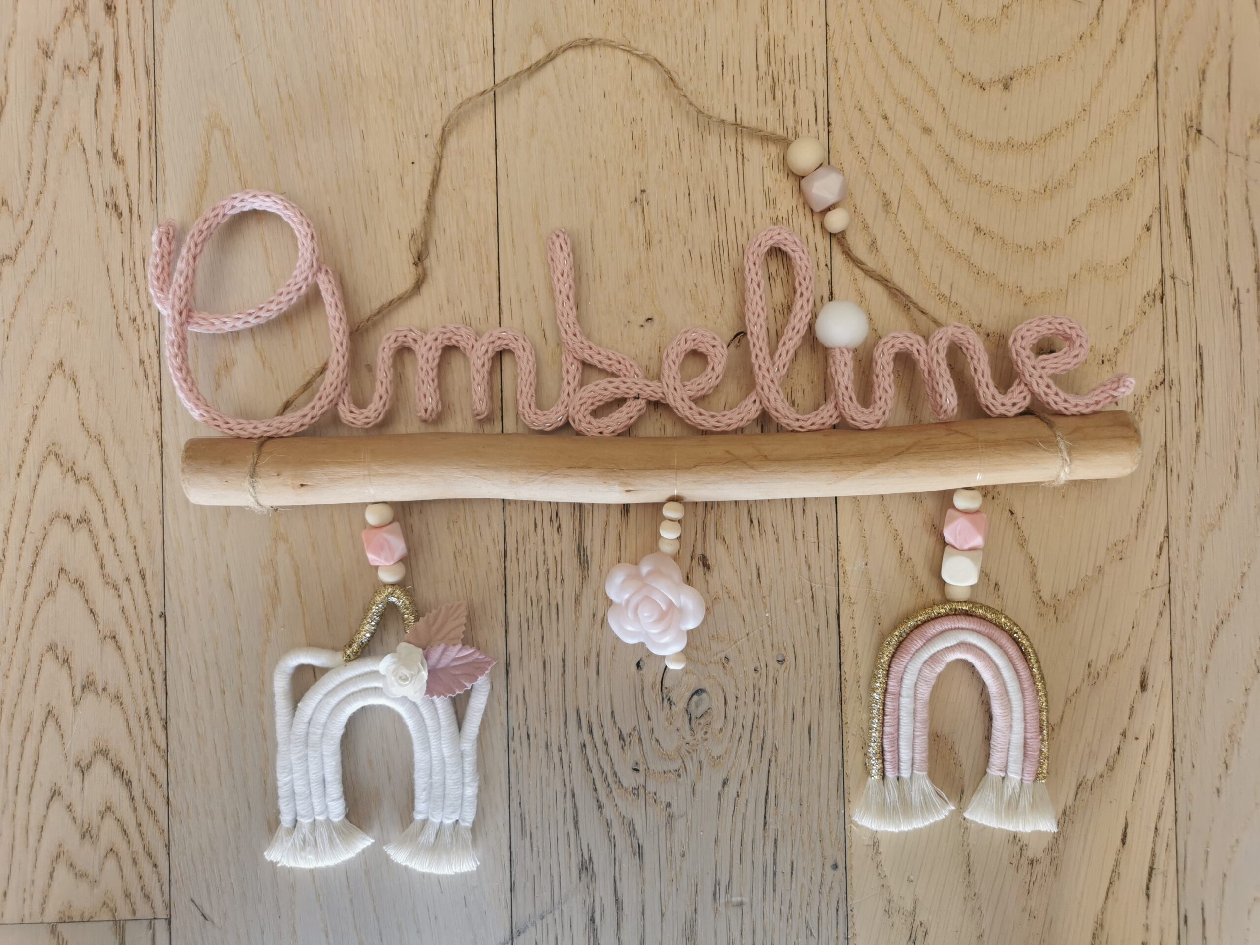 Prénom en tricotin sur bois flotté / arc en ciel + personnalisation