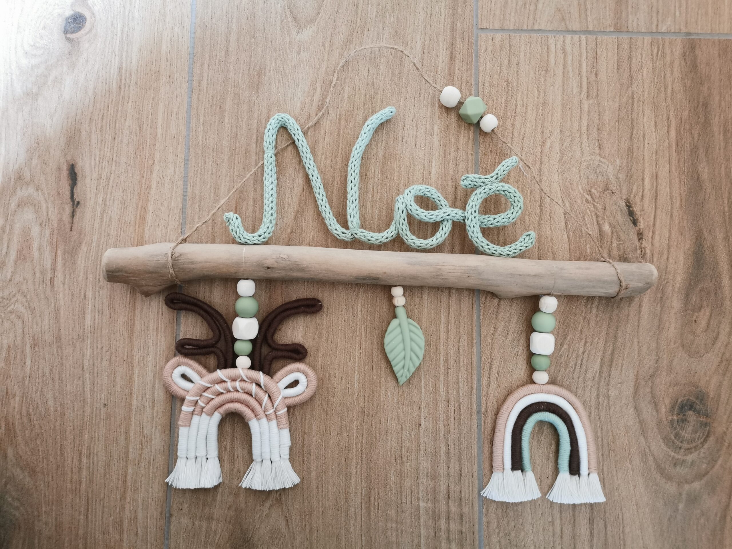 Prénom tricotin sur bois flotté animaux avec arc-en-ciel